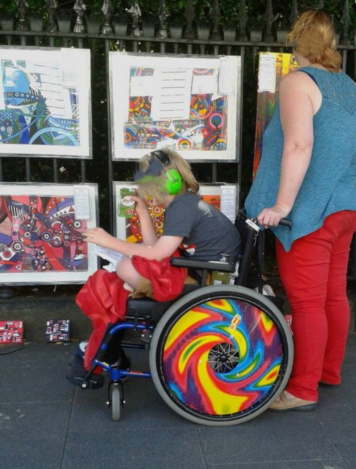 This lovely lady heard about my work and brought her son over to have a look at my paintings. She was particulary drawn to my painting Ryan's Rainbow and the story behind it. Coincidentally the colours of the painting matched her sons wheels.