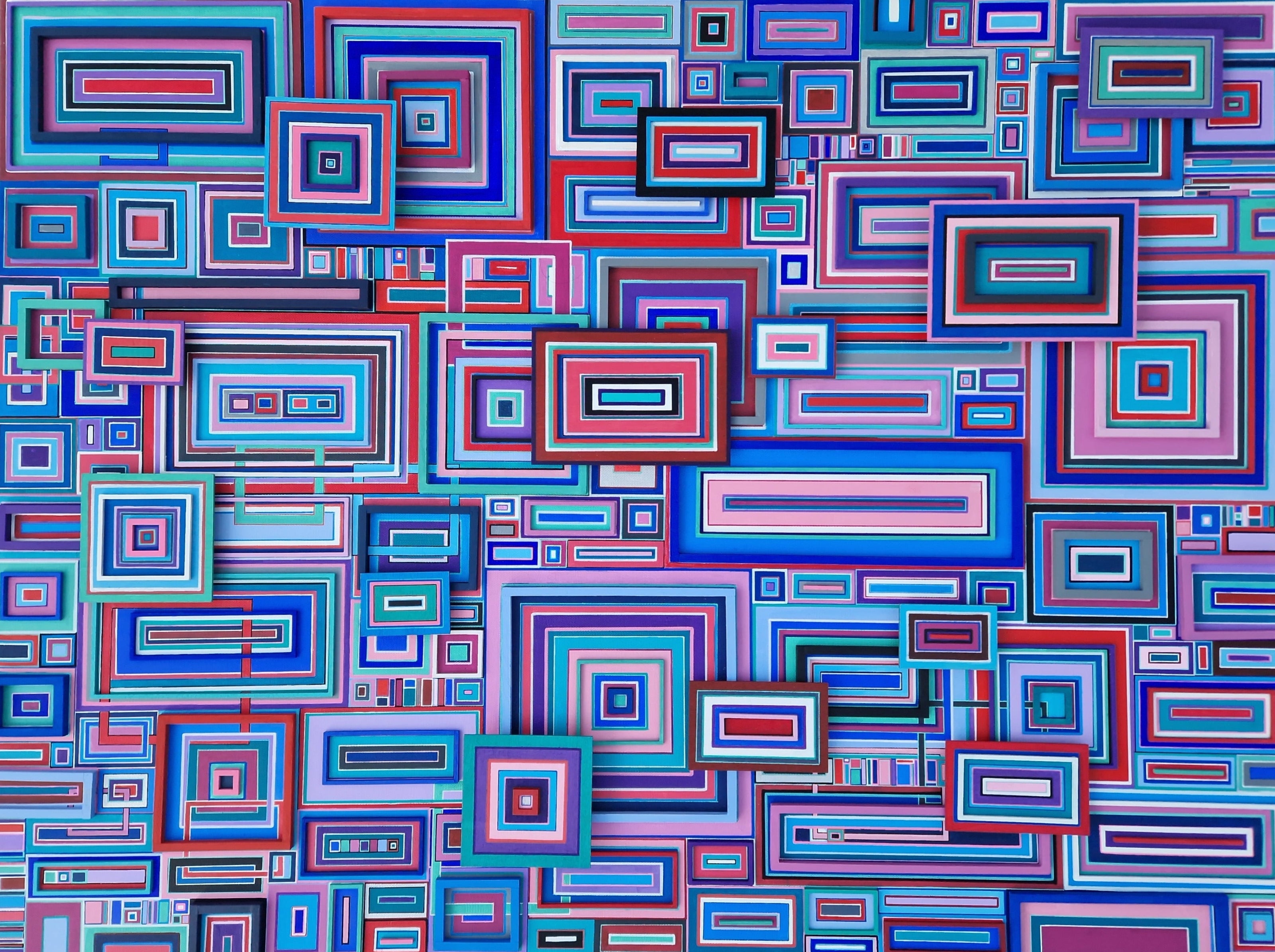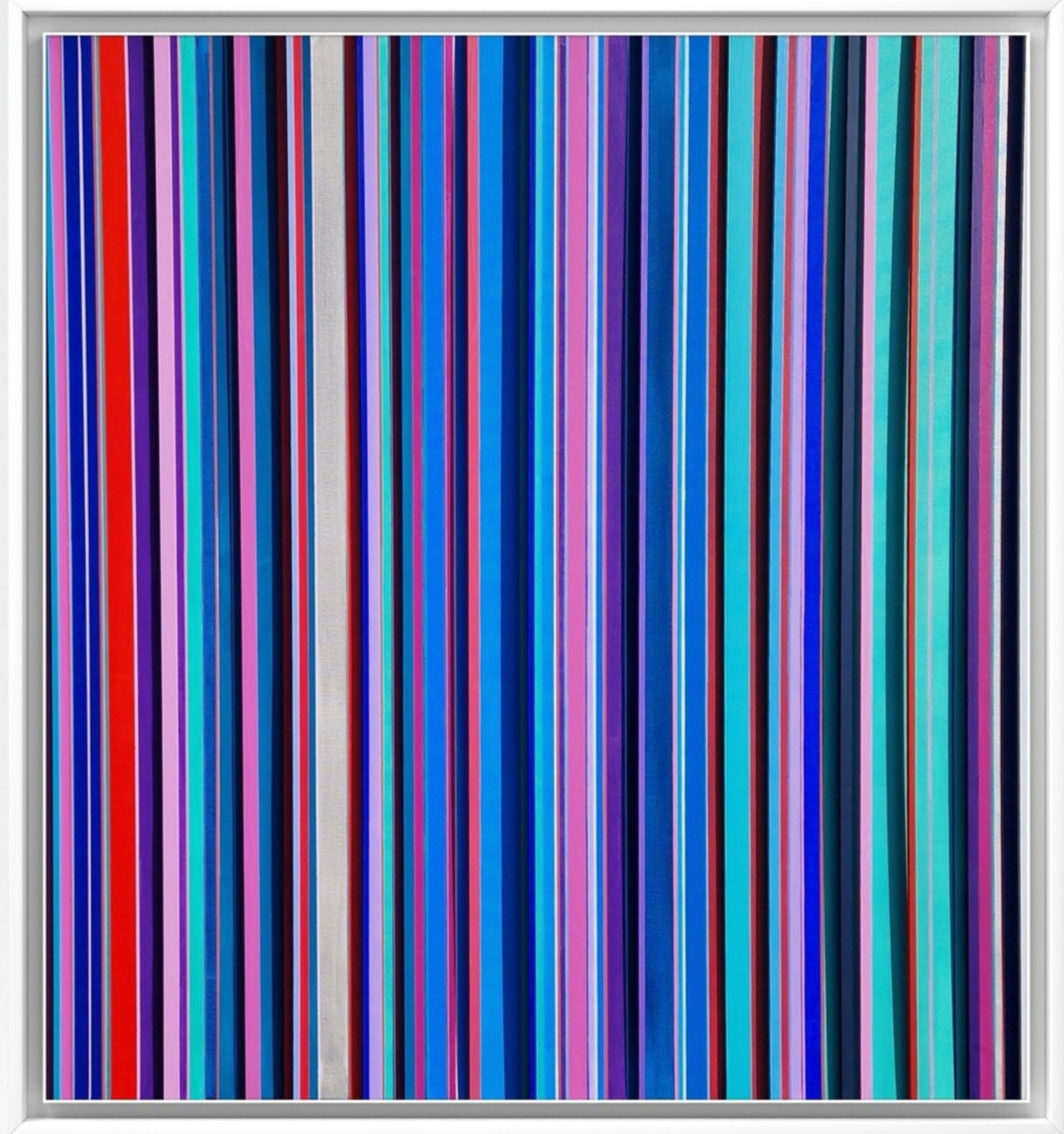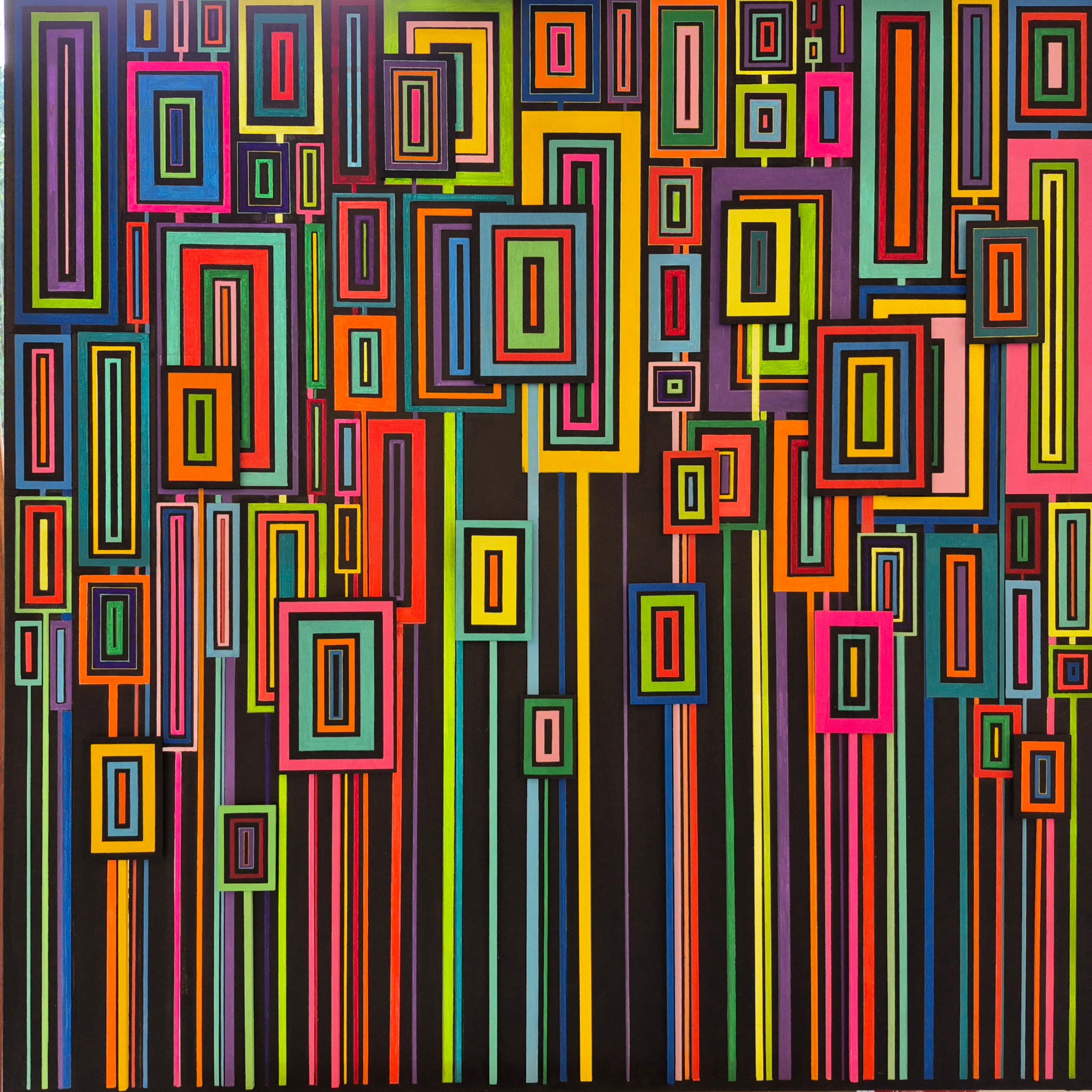 This painting is actually three dimensional. It is layered with multicoloured, perfectly measured strips of wood, designed to run over the edge and encase the piece, appearing to trap it against the wall with colourful prison bars.