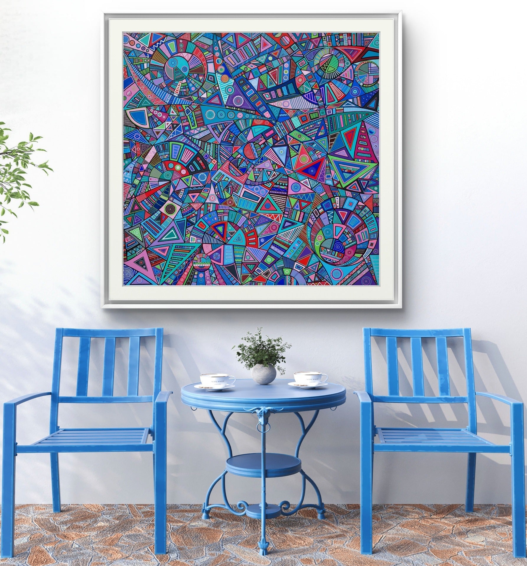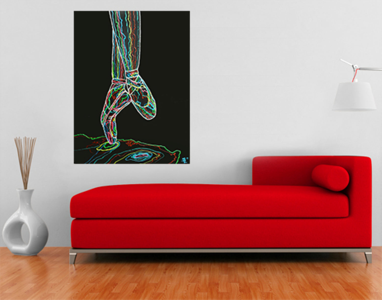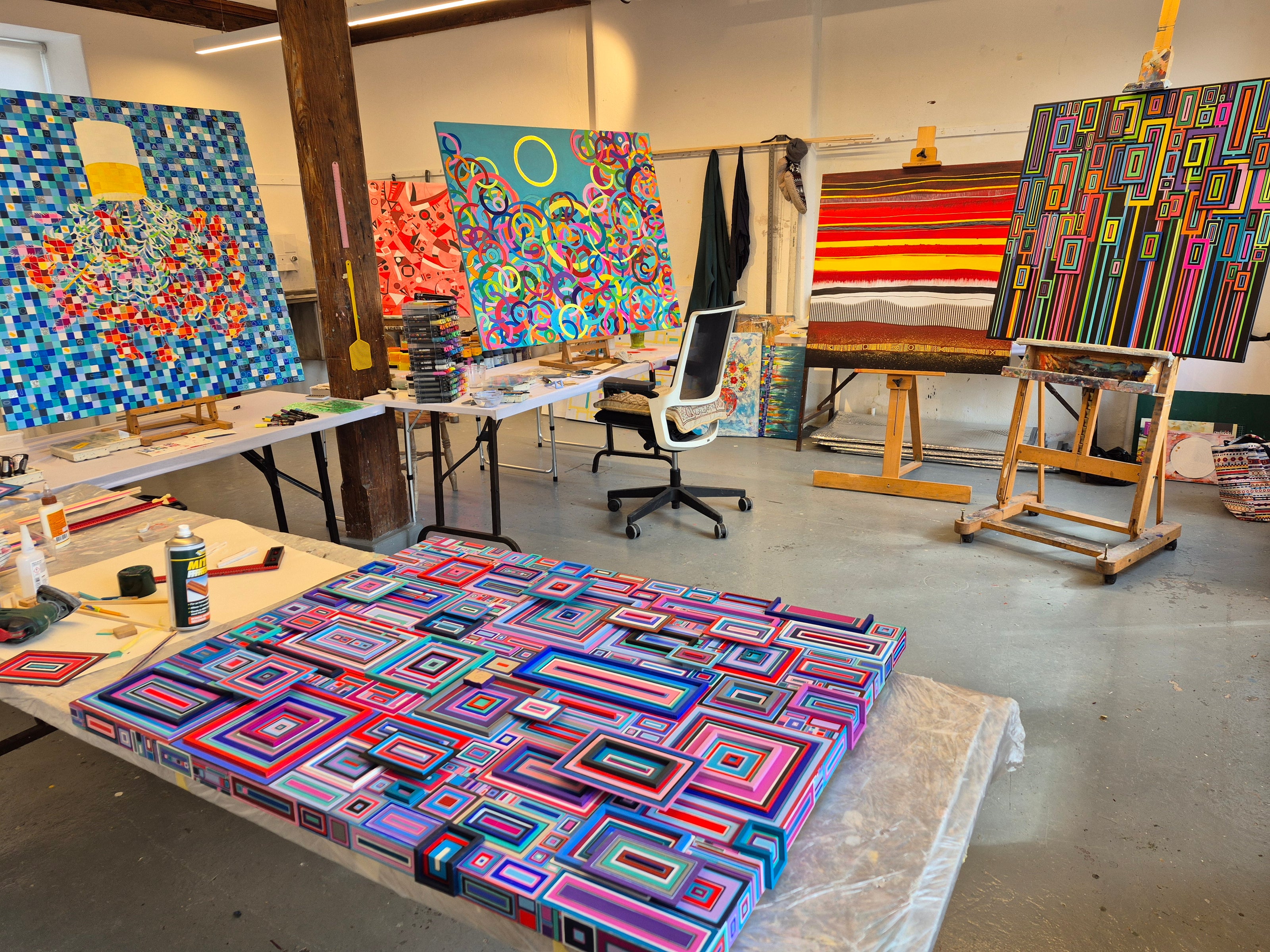 This painting is actually three dimensional. It is layered with multicoloured, perfectly measured strips of wood, designed to run over the edge and encase the piece, appearing to trap it against the wall with colourful prison bars.