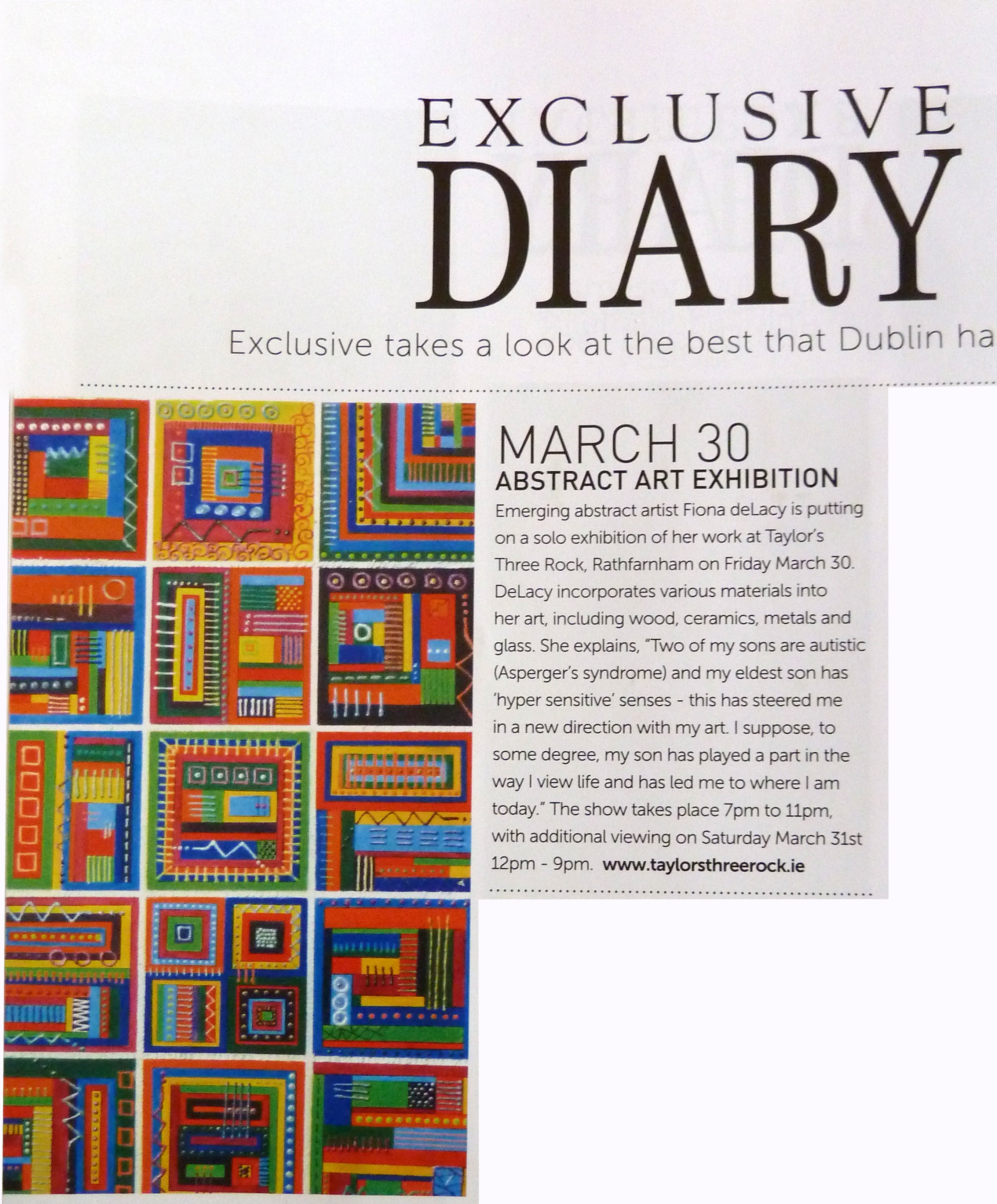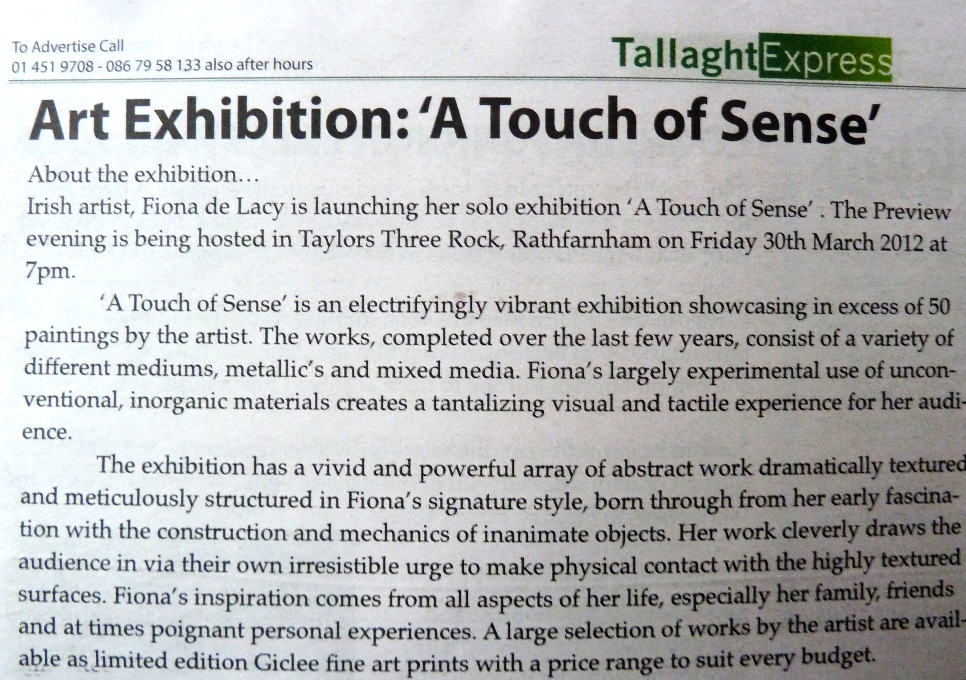 featured a full page article on me in which my upcoming exhibition 'A touch of sense' in Taylors Three Rock