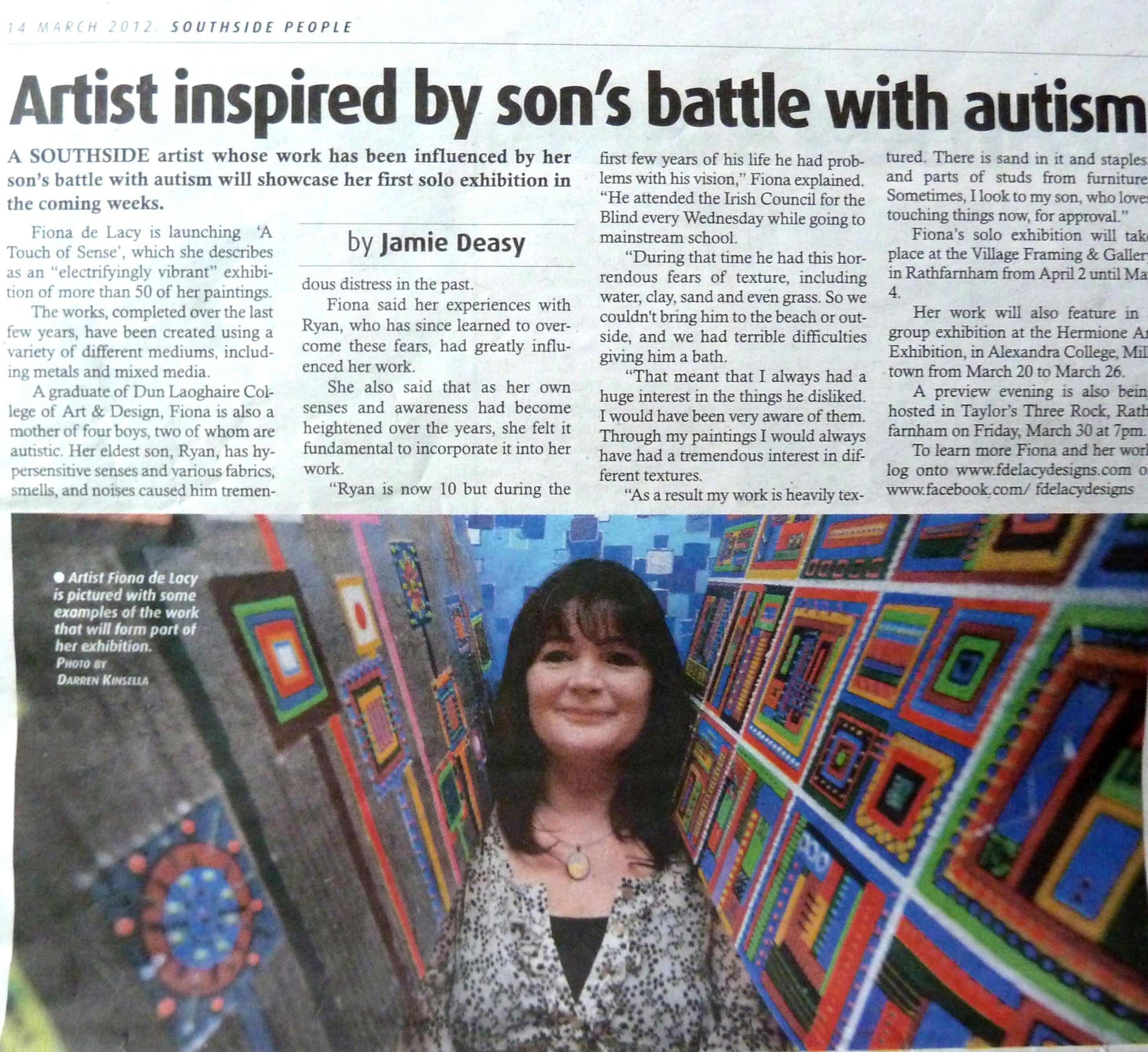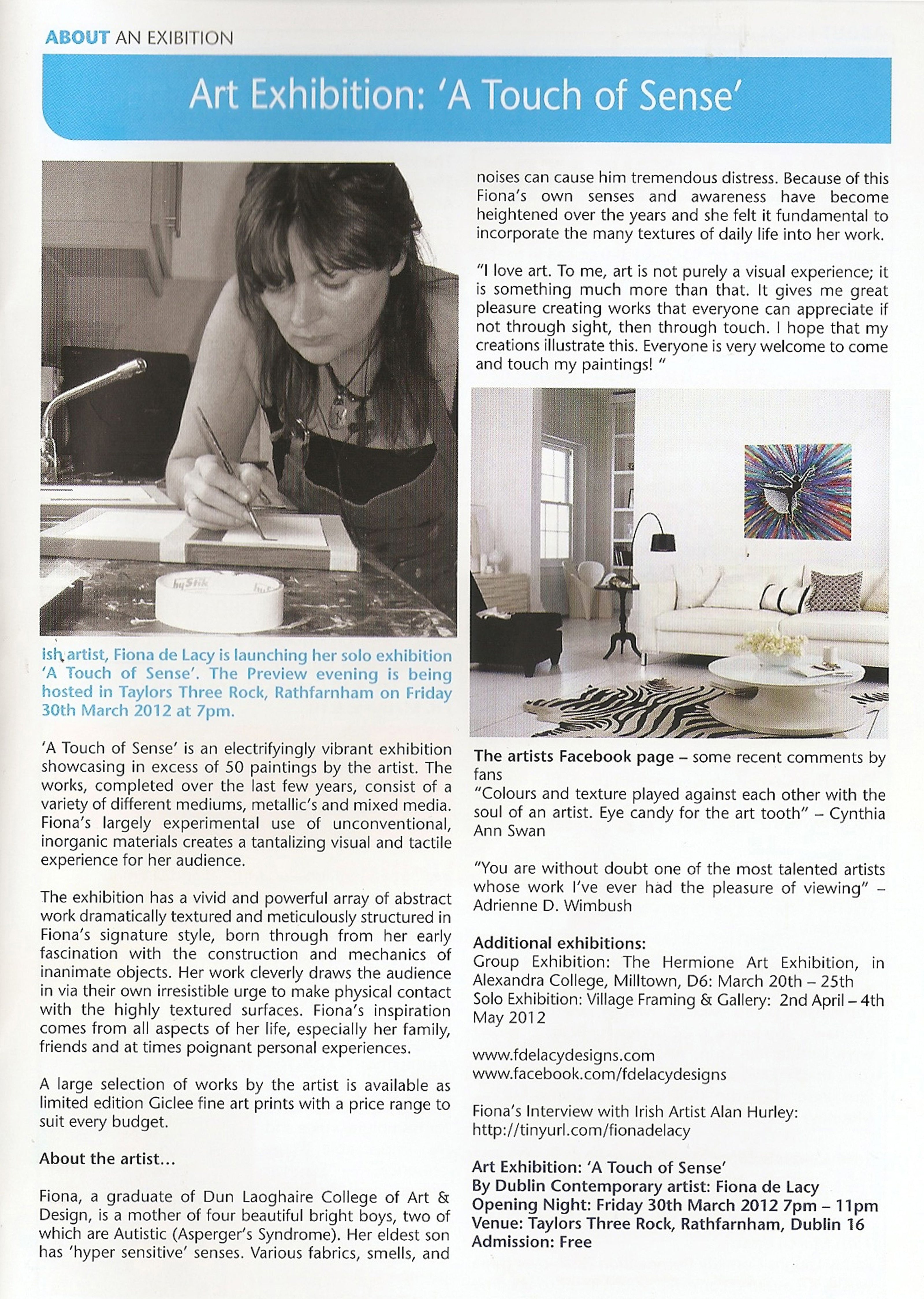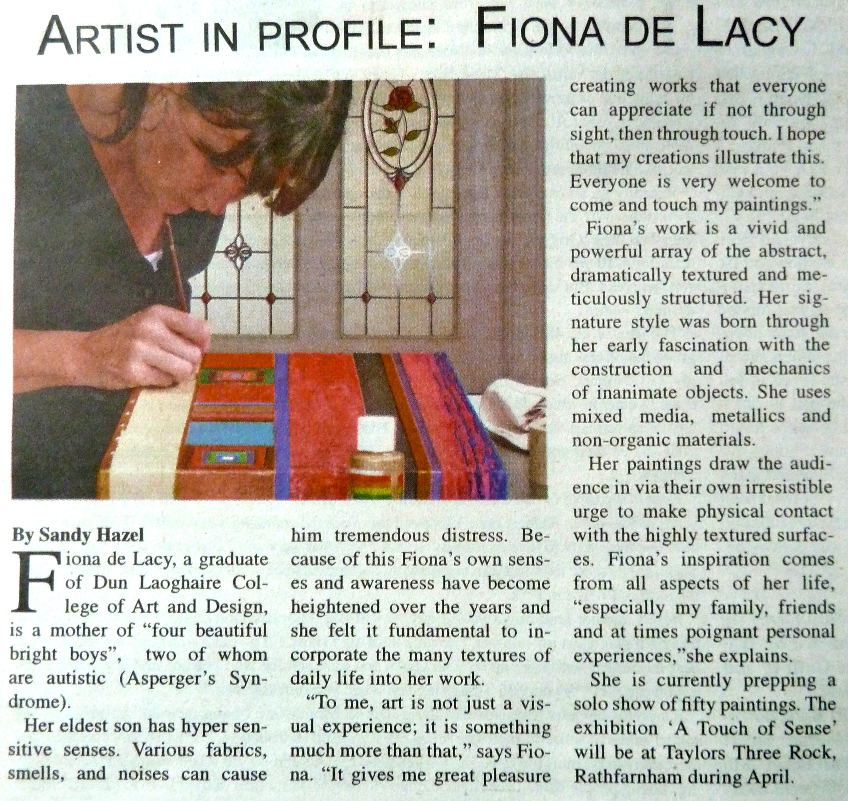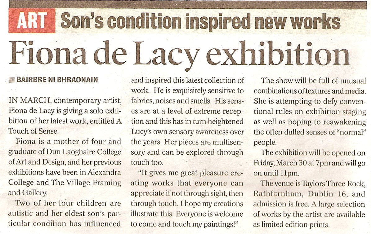 Bairbre Ni Bhraonain wrote an article about my upcoming exhibition 'A Touch of Sense' (page 7)